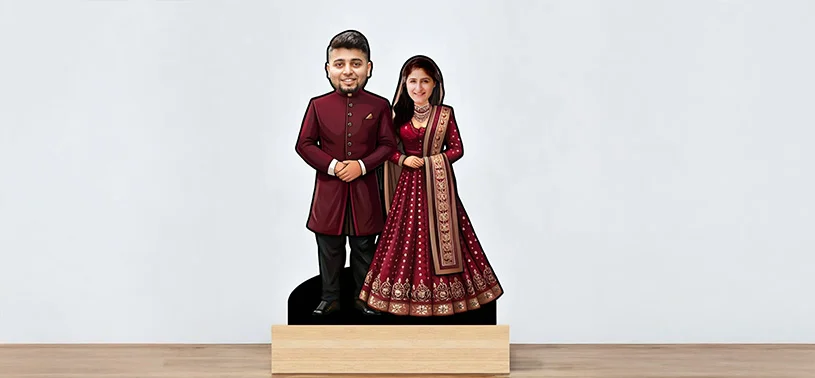Newly Married Couple Caricature: If you are not married yet but have a vision of marrying your girlfriend or boyfriend one day, then this is a perfect gift for you. Giving this gift shows that you are promising a future together. The caricature represents you and your partner dressed in red traditional wedding outfits, posing in front of the camera after the wedding.
