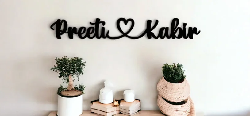 It can be placed in the bedroom and features both your first name and your partner’s first name, with a heart design in between. The names are written in a neat, attractive font, which makes the emblem look very cute and pleasing.