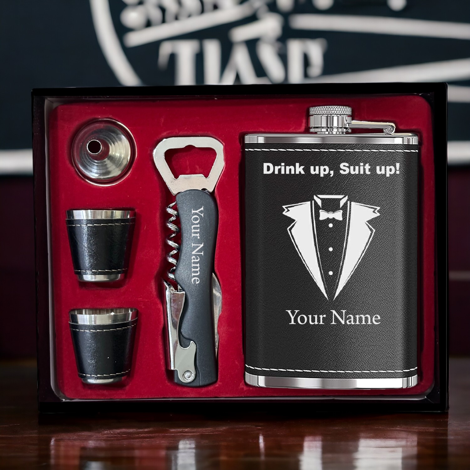 Embrace classic sophistication with our Gentleman’s Name Personalized Black Leather Hip Flask Set. Crafted from premium leather, this custom flask set includes a sleek opener, making it the perfect gift for the refined gentleman. Ideal for all occasions!