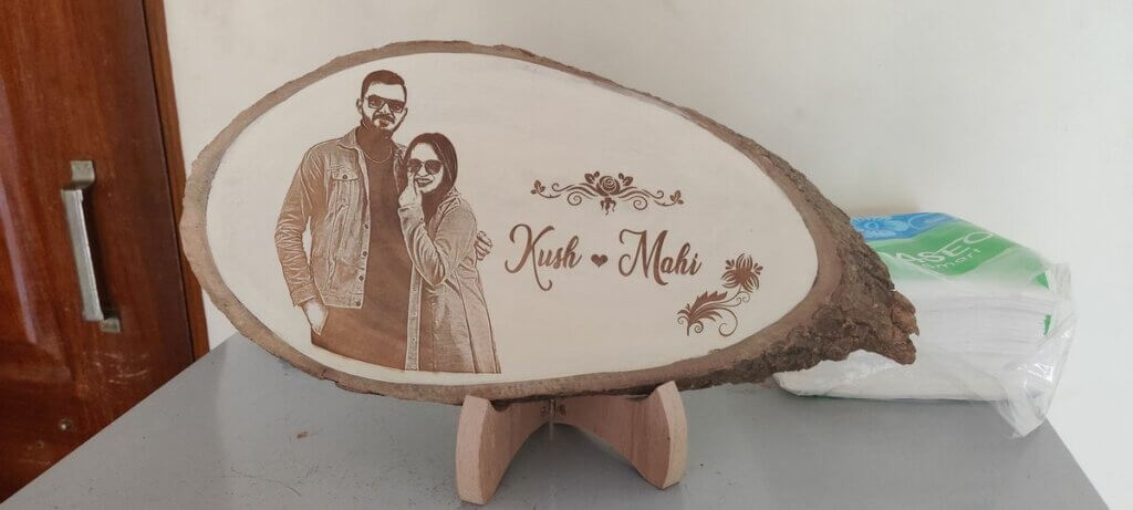 The wooden frame size may vary between 10 to 15 inches in length. Once you order your photo frame, you have to send us your photo and text to us, to be engraved on the wooden photo frame. We will send you a computerized generated preview. We offer lifetime engraving on our wooden photo frames. You will get the wooden photo frame with a wooden stand. This photo frame is completely eco-friendly and proudly made in India.